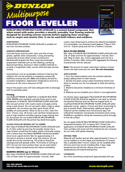 Click here to access Dunlop 15kg Multi Purpose Floor Leveller – user Guide When you’re in need, we’re here to help! We offer a range of services including plumbing, electrical, gas fitting, handyman services, appliance repairs, bathroom renovation and much more. Contact us now or check out our rates and payment plans.