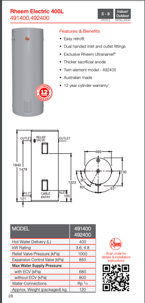 Click here to access Specification-Sheet-Rheem-400L-Electric-Hot-Water-System When you’re in need, we’re here to help! We offer a range of services including plumbing, electrical, gas fitting, handyman services, appliance repairs, bathroom renovation and much more. Contact us now or check out our rates and payment plans.