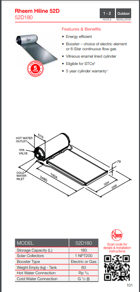 Click here to access Specification-Sheet-Rheem-Solar-Hiline-180-litre-3.6kw-52D180R7-1NPT When you’re in need, we’re here to help! We offer a range of services including plumbing, electrical, gas fitting, handyman services, appliance repairs, bathroom renovation and much more. Contact us now or check out our rates and payment plans.