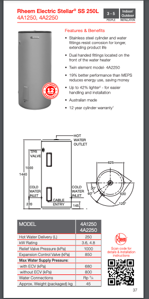 Click here to access Specification-Sheet-Rheem-Stellar-250L-Stainless-Steel-Electric-Hot-Water-System When you’re in need, we’re here to help! We offer a range of services including plumbing, electrical, gas fitting, handyman services, appliance repairs, bathroom renovation and much more. Contact us now or check out our rates and payment plans.